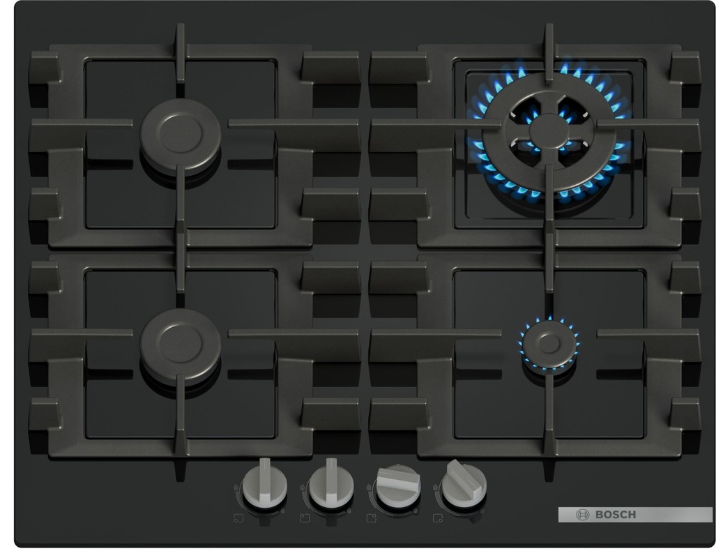 Plinska kuhalna plošča z litoželeznimi nosilci za posodo, primernimi za pomivanje v pomivalnem stroju.
