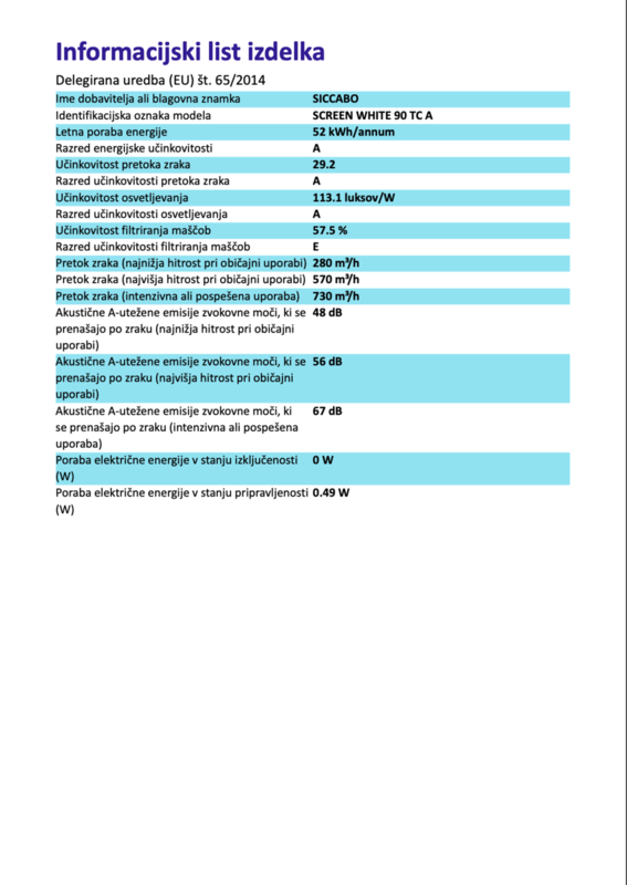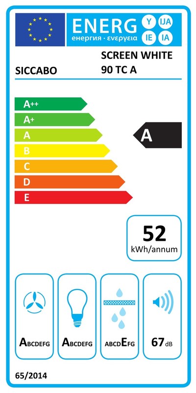 Kuhinjska napa SICCABO WHITE SCREEN 90 je poševna dekorativna napa, ki s svojim lepim izgledom in učinkovitostjo spada v energijski razred A. Ima alu maščobni filter, katerega preprosto operete v pomivalnem stroju enkrat na tri mesece. Je visoko učinkovita, z največjim pretokom zraka do 730 m3/h in kakovostno LED osvetlitvijo.