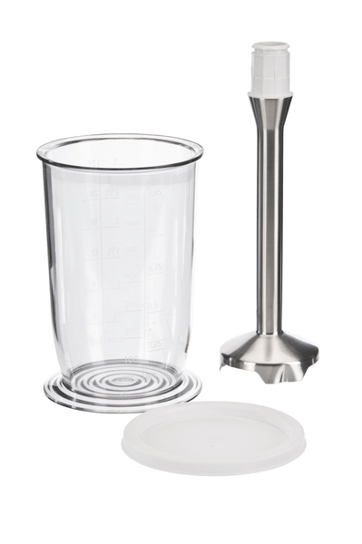Vključuje merilni vrč z oznakami prostornine in pokrovom.