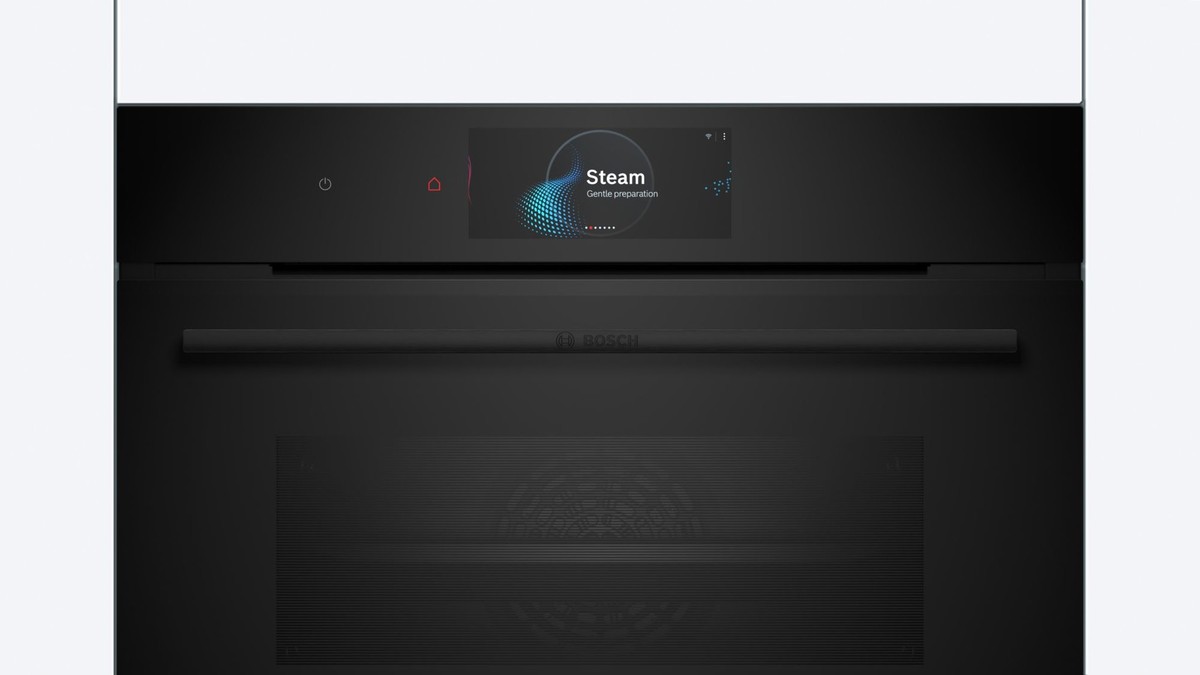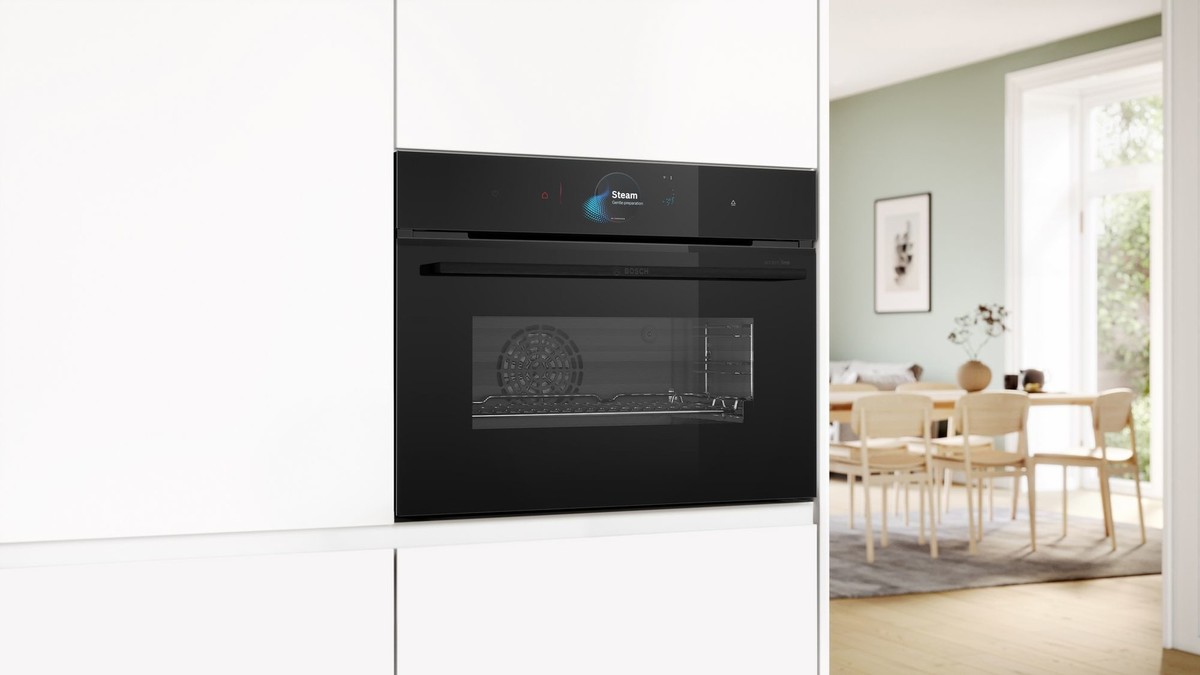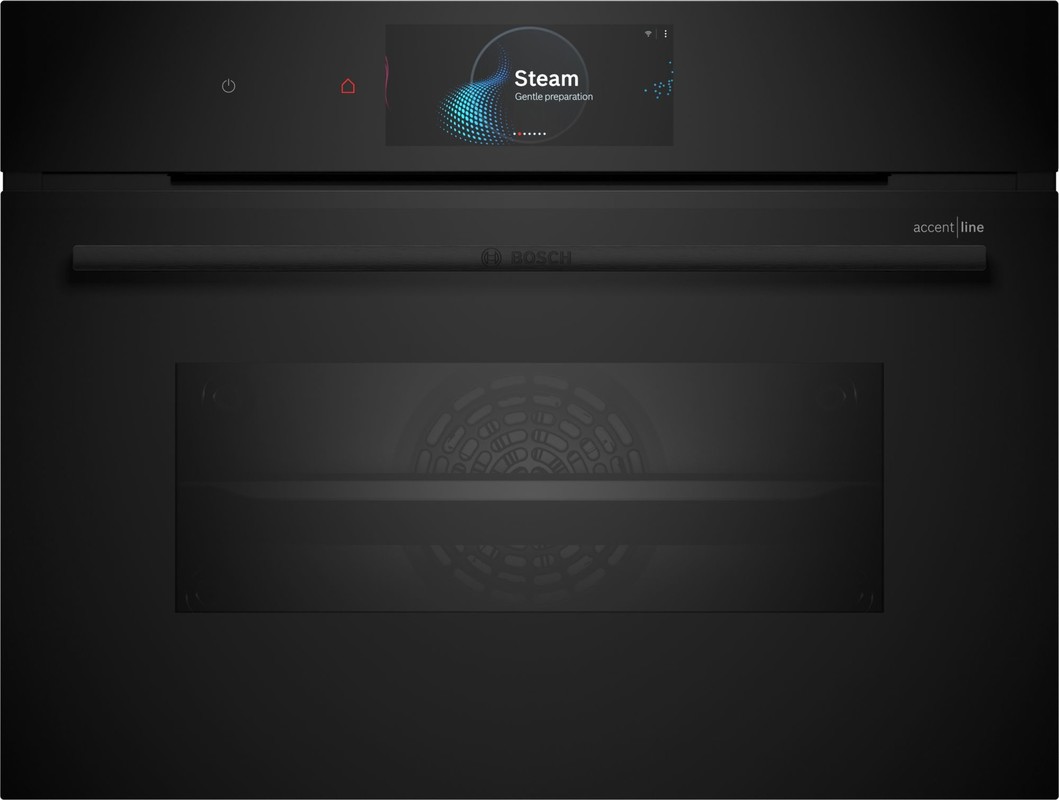 Kompaktna parna pečica z digitalnim upravljalnim obročem in TFT zaslonom na dotik, funkcija HotAir: omogoča kombiniranje nežnega kuhanja z močjo vročega zraka. Home Connect za nadzor prek aplikacije.