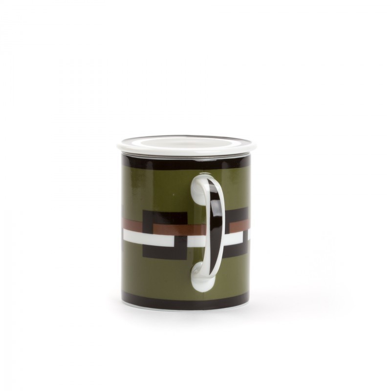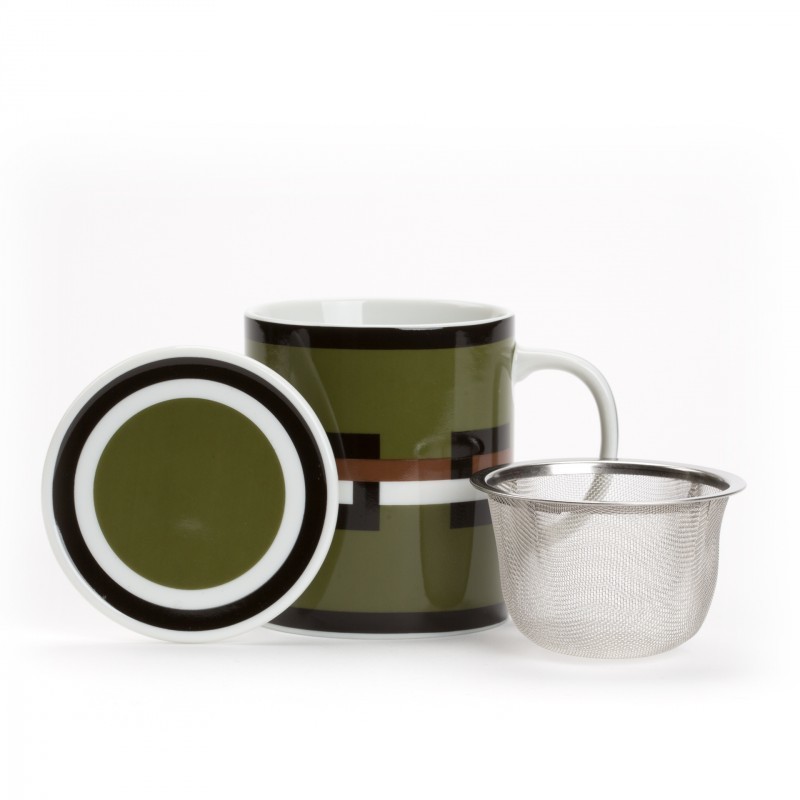 Porcelanska skodelica Graphik je potiskana z elegantnim grafičnim vzorcem v kaki zeleni barvi. Dopolnjujeta jo čajno cedilo iz nerjavnega jekla in pokrovček, ki zadržuje toploto med pripravo čaja, kasneje pa ga lahko uporabite kot podstavek za cedilo. Popoln komplet za pripravo vaše najljubšega čajnega napitka.